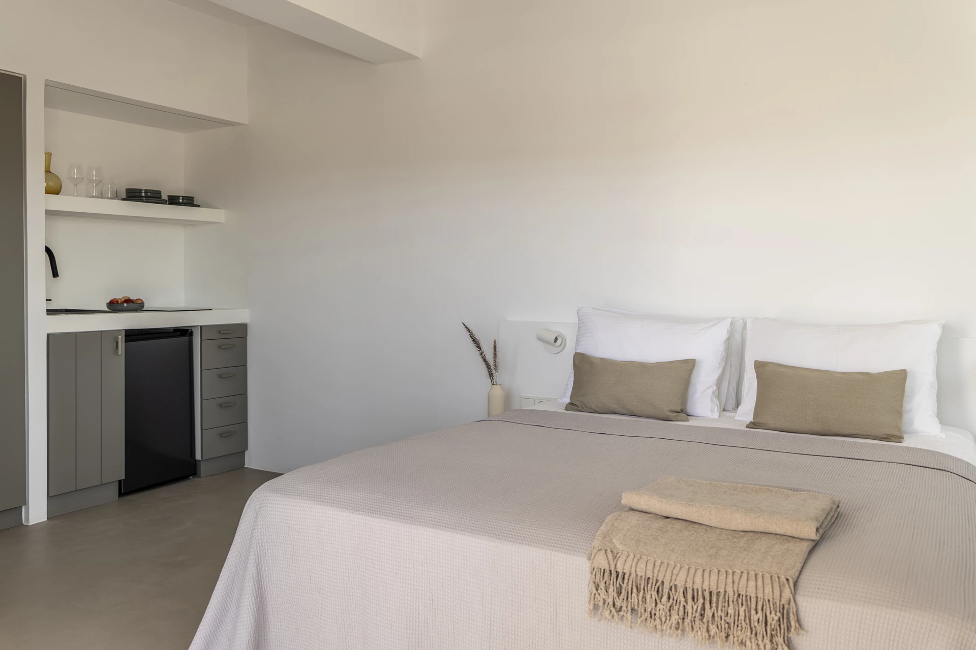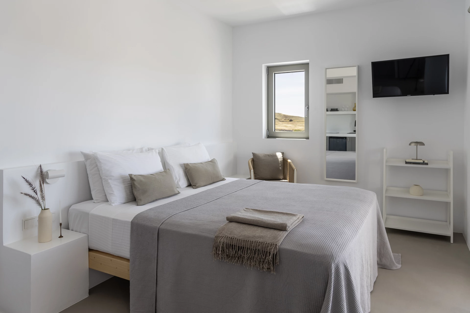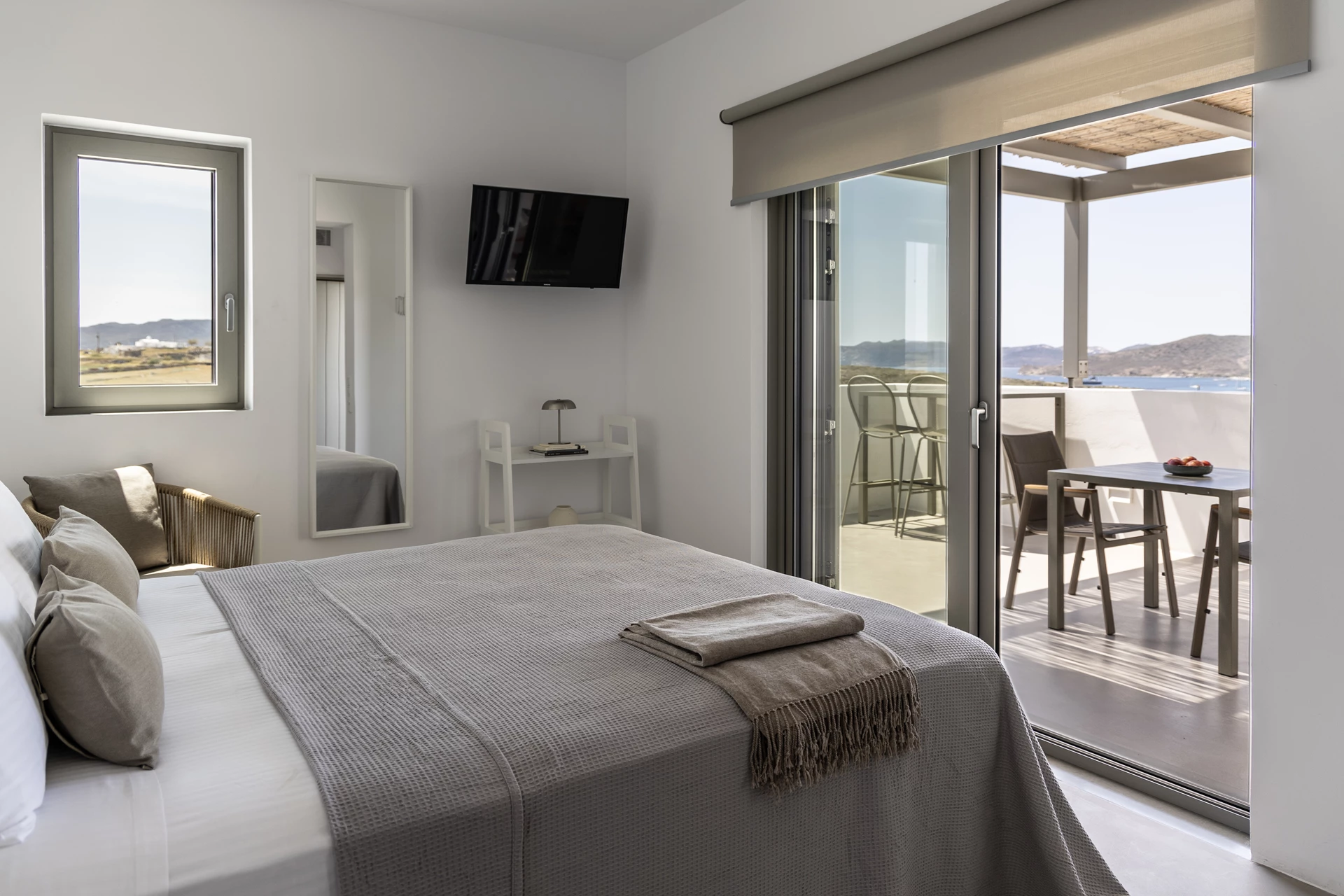 Laissez-vous bercer par l'ambiance apaisante d'Iris. D'une superficie de 26 m² et dotée d'une terrasse de 34 m², cette suite offre un havre de paix avec une vue imprenable sur la mer, le port d'Adamas, le mont du Prophète Ilias et la piscine. Savourez votre petit-déjeuner ou détendez-vous en soirée sur votre terrasse privée, équipée d'une kitchenette.