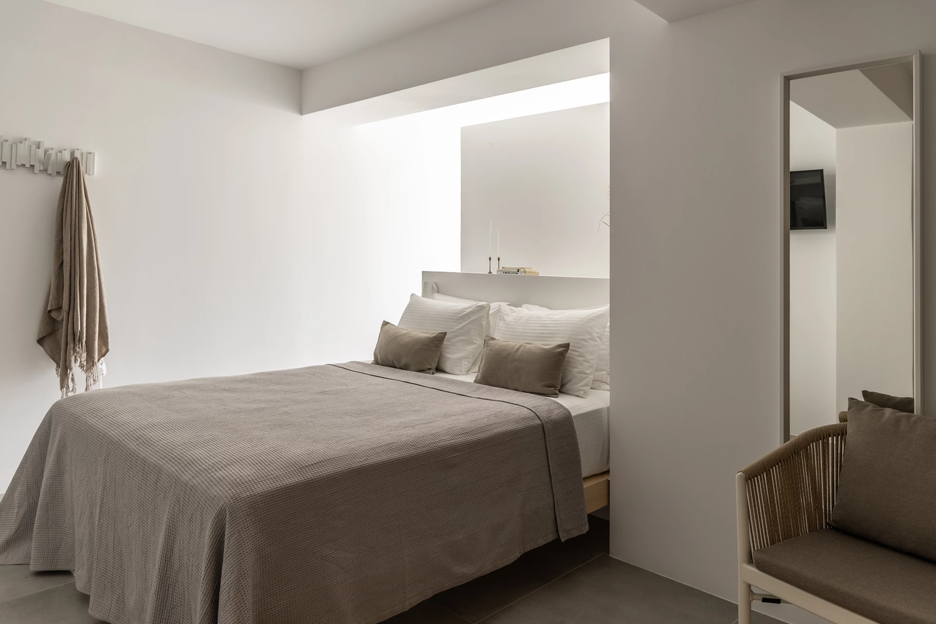 Si l'intérieur d'Obsidian est synonyme d'intimité et de tranquillité, son charme ne s'arrête pas à la porte. La chambre s'ouvre harmonieusement sur le jardin commun, où des transats sont disposés face à la vue panoramique imprenable sur la mer, le port d'Adamas et la piscine. Offrant un mélange harmonieux de confort, d'intimité et de vues apaisantes sur l'extérieur, Obsidian est votre sanctuaire pour une retraite des plus ressourçantes.