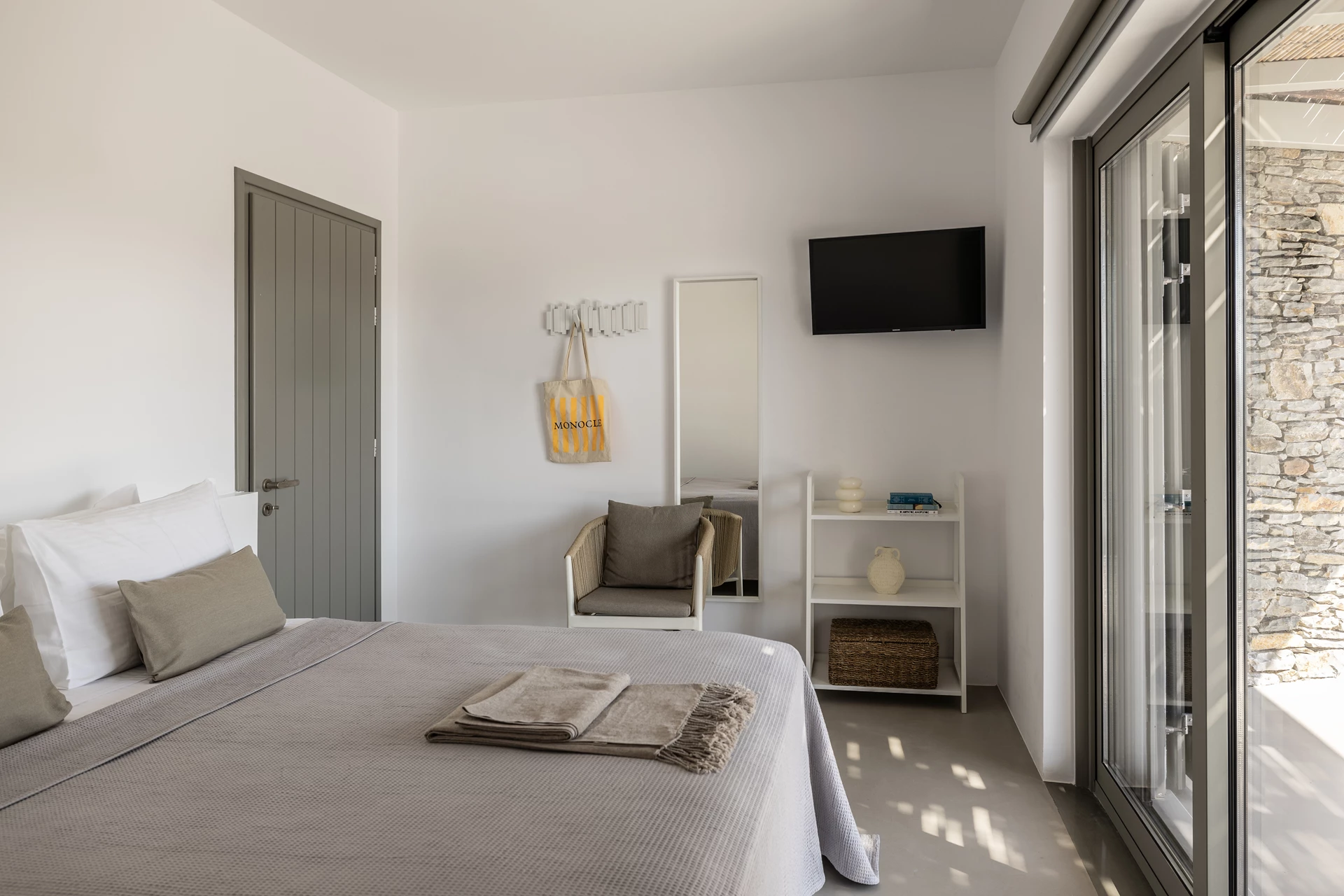 Vivi la tranquillità nel cuore di Milos. Questa suite di 26 mq si apre su una spaziosa terrazza di 31 m², offrendo viste panoramiche sul porto di Adamas, sulla maestosa montagna del Profeta Ilias e sulla suggestiva piscina dell'hotel. Inizia la giornata con un caffè sulla tua terrazza privata e concludela con un pittoresco tramonto.