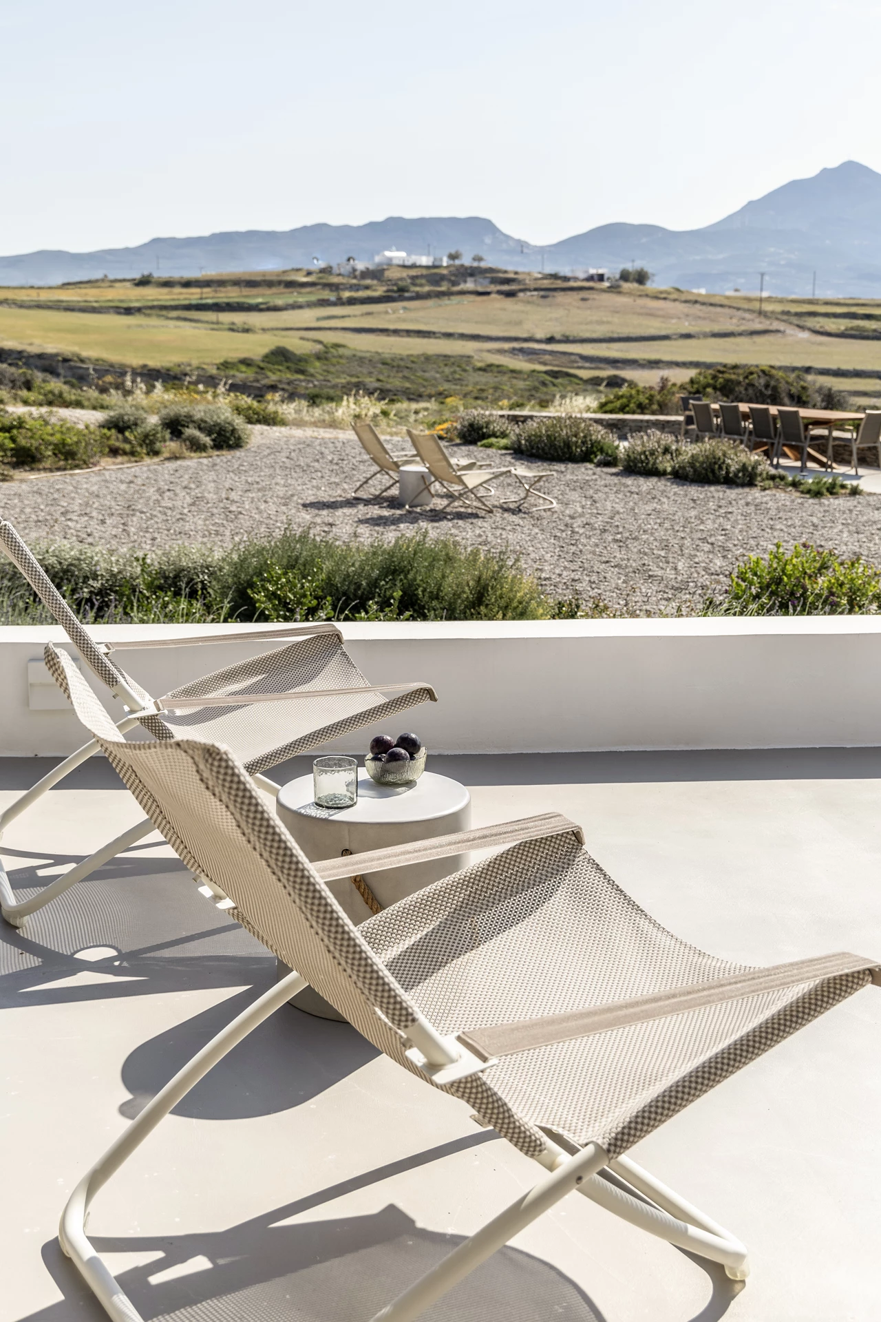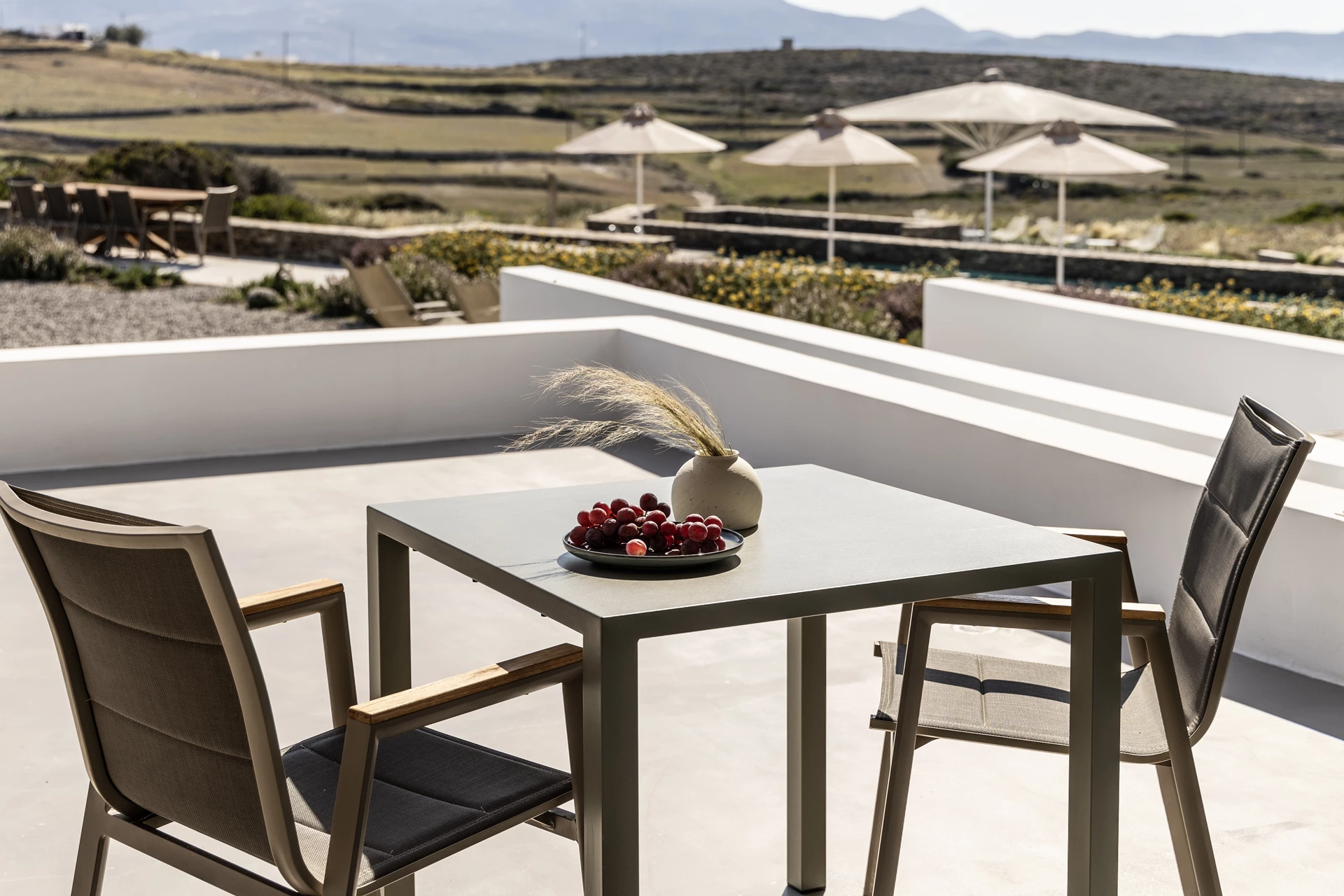 Vivi la tranquillità nel cuore di Milos. Questa suite di 26 mq si apre su una spaziosa terrazza di 31 m², offrendo viste panoramiche sul mare, sul porto di Adamas, sulla maestosa montagna del Profeta Ilias e sulla suggestiva piscina dell'hotel. Inizia la giornata con un caffè sulla tua terrazza privata e concludela con un pittoresco tramonto.