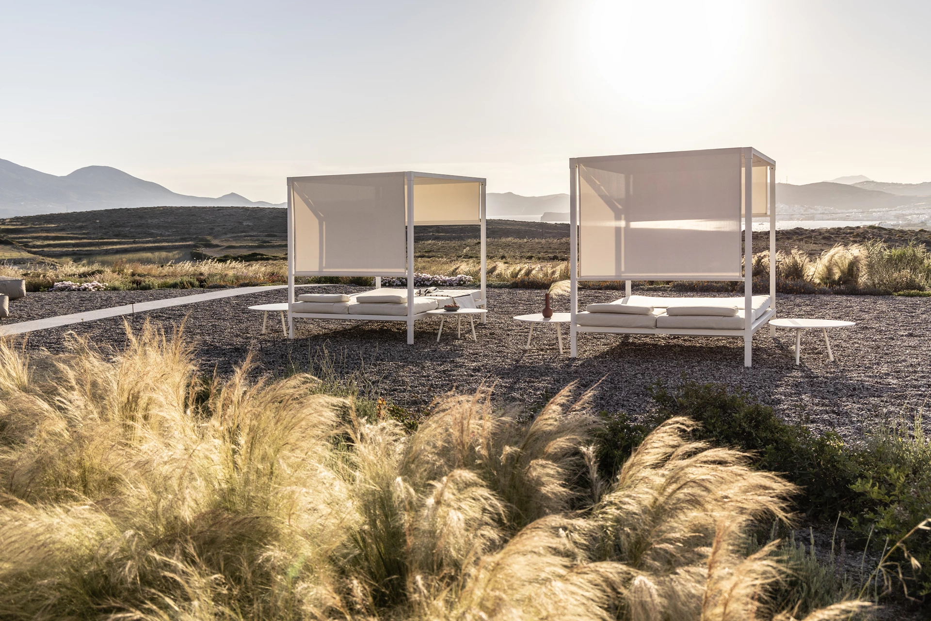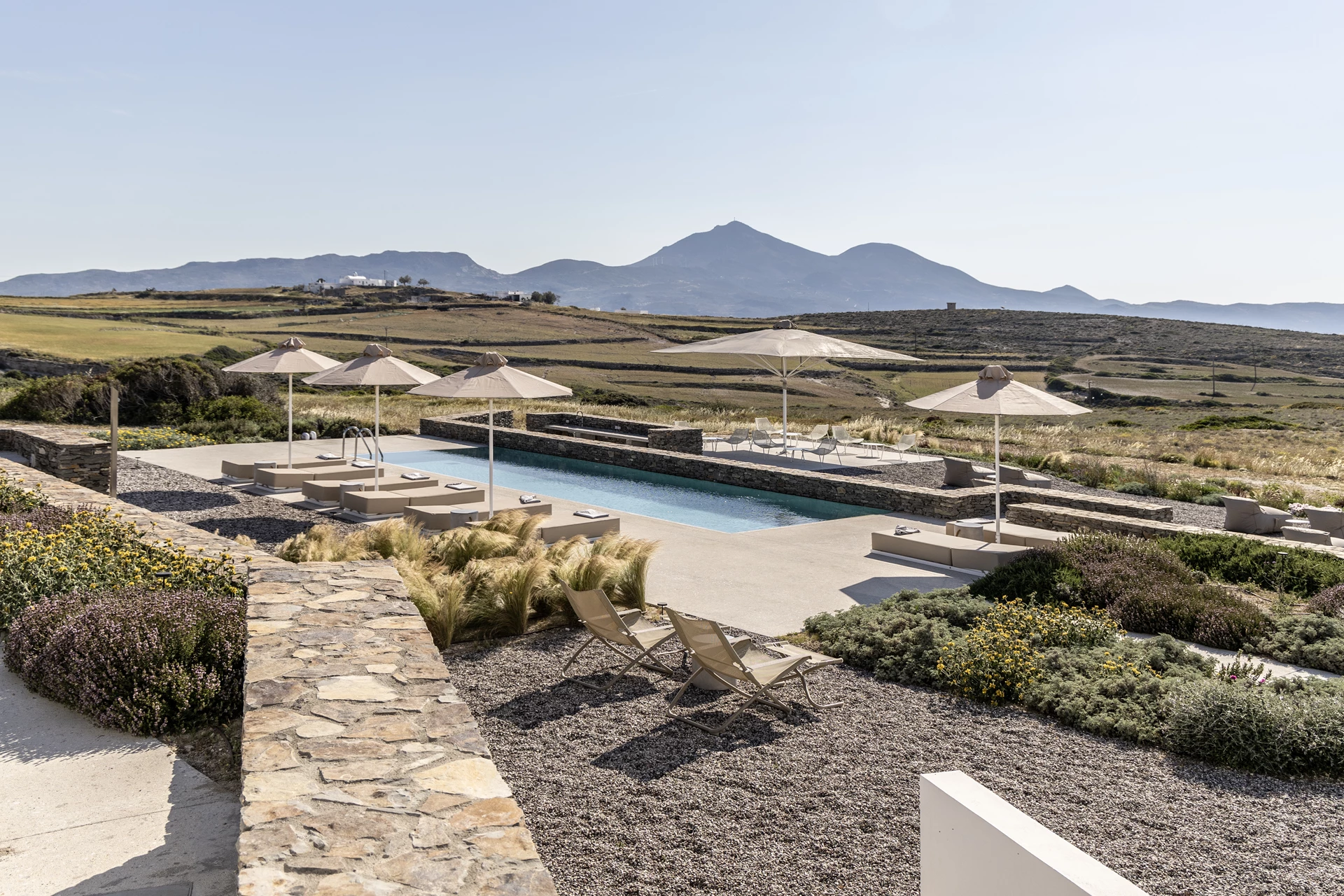 Respira l'atmosfera rilassante di Iris. Con 26 m² e una terrazza di 34 m², è un rifugio tranquillo con viste panoramiche sul porto di Adamas, sul monte del Profeta Ilias e sulla piscina. Goditi la colazione o rilassati la sera sulla tua terrazza privata, con la comodità di un angolo cottura completamente attrezzato.