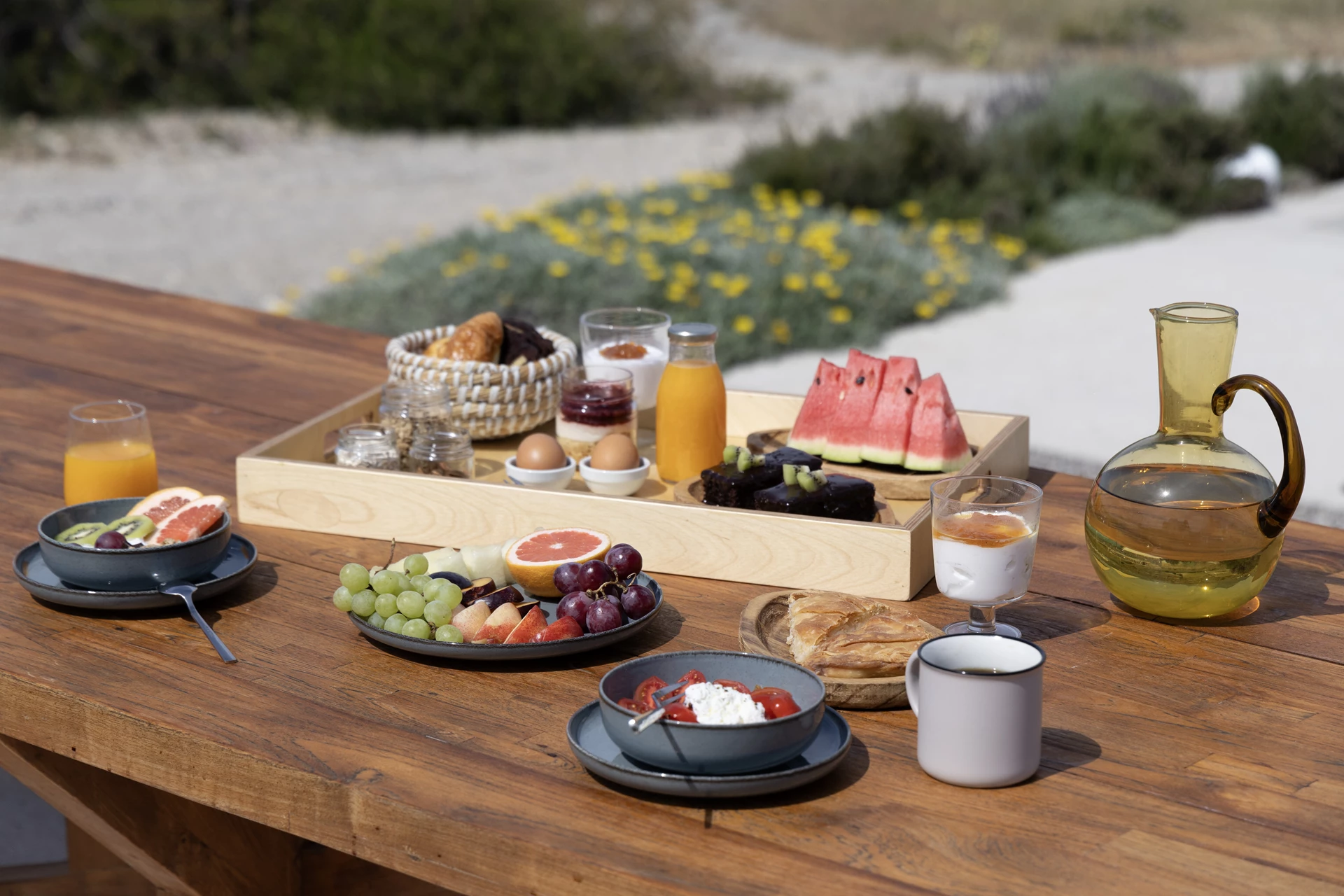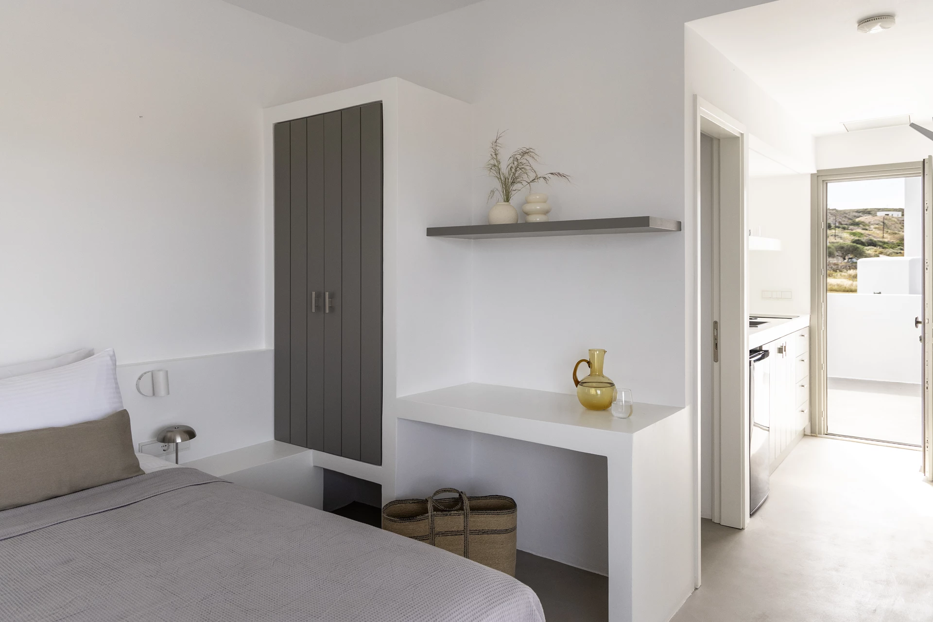 Oltre l'interno, ti attende una spaziosa terrazza privata, arredata con un tavolo in design EMU, due sedie, un paio di sdraio in stile EMU e uno sgabello. Questo spazio è perfetto per cenare all'aperto, godersi la tranquillità o semplicemente crogiolarsi al sole. L'area privata all'aperto di Dafne offre la combinazione perfetta di comfort, comodità e privacy, garantendo un soggiorno davvero rigenerante.