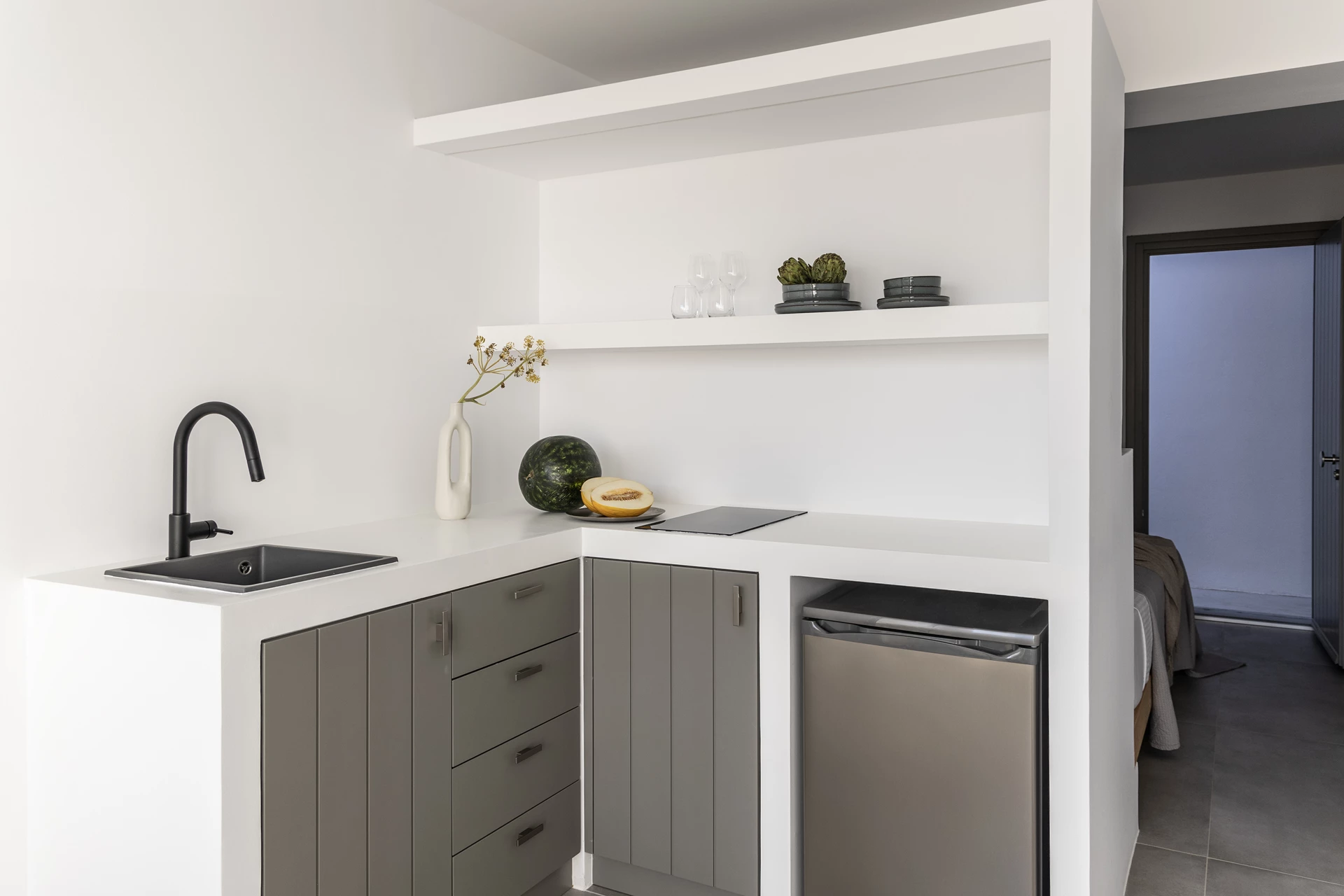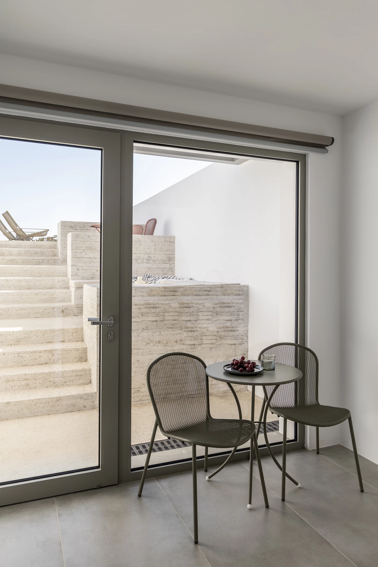Sebbene gli spazi interni di Obsidian racchiudano privacy e tranquillità, il suo fascino non si ferma alla porta. La stanza si estende senza soluzione di continuità fino al giardino comune, dove sono posizionate sdraio dedicate per affacciarsi sulla vista panoramica mozzafiato sul mare, sul porto di Adamas e sulla piscina. Offrendo un armonioso mix di comfort, privacy e viste serene all'aperto, Obsidian è il tuo rifugio per un ritiro profondamente soddisfacente.