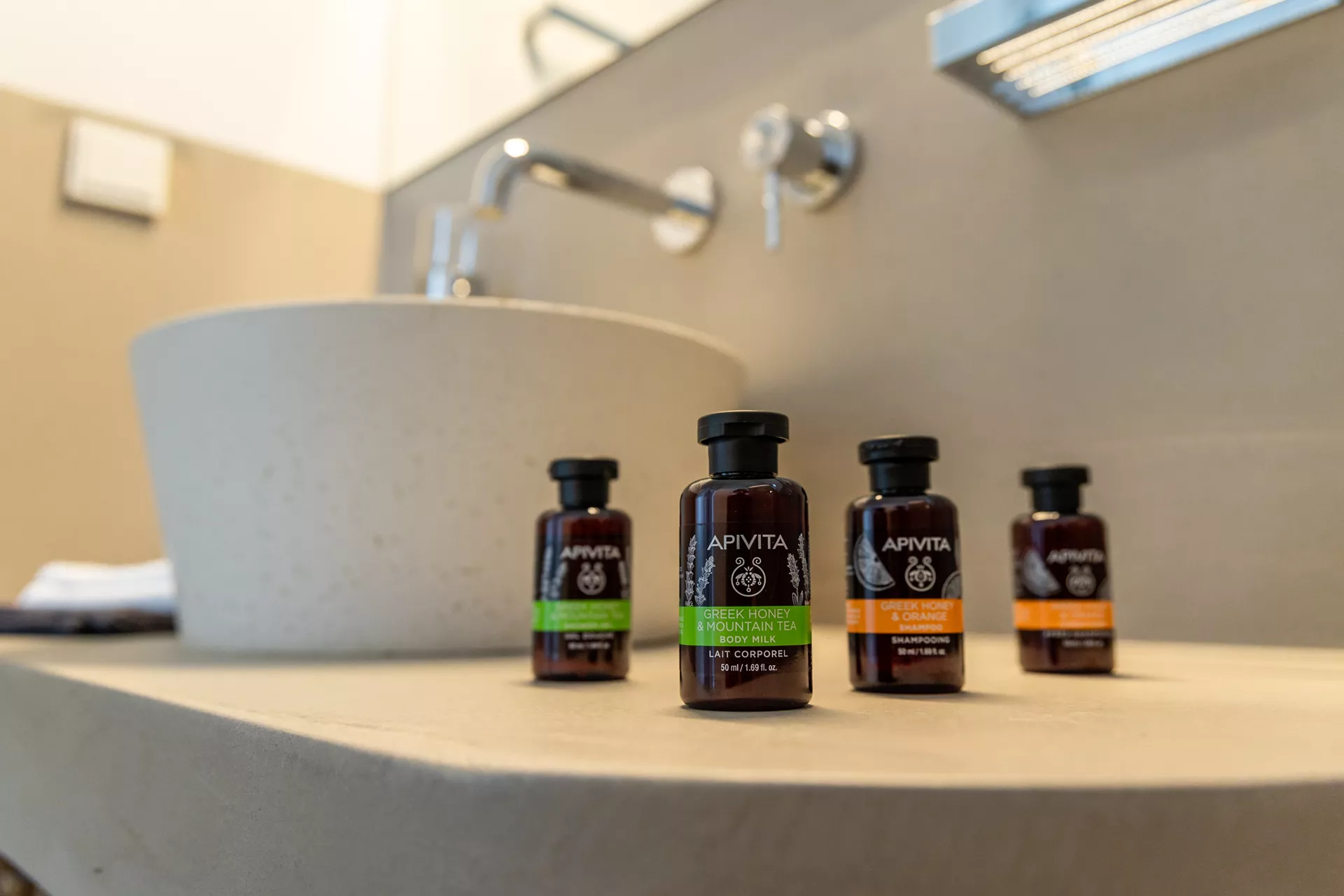 Dotato di docce, prodotti per l'igiene personale (sapone, shampoo), asciugacapelli, accappatoio e pantofole.